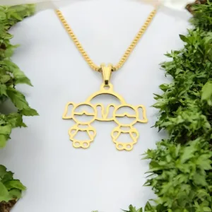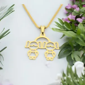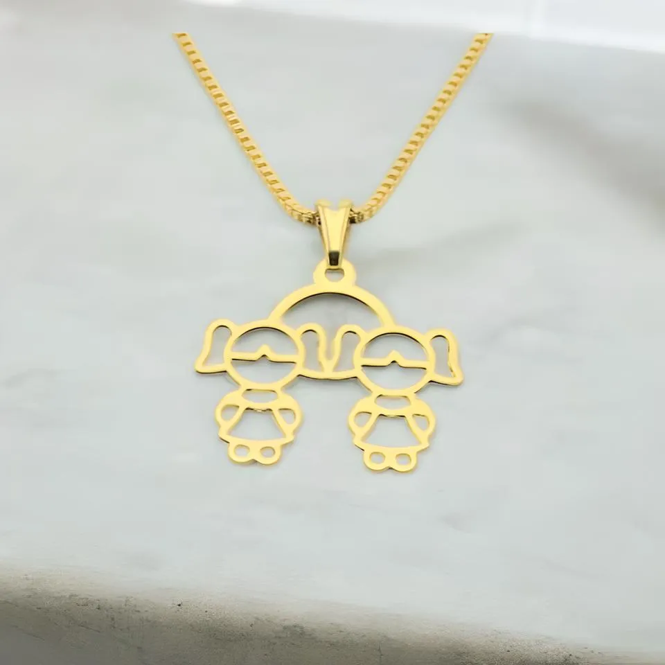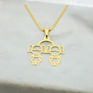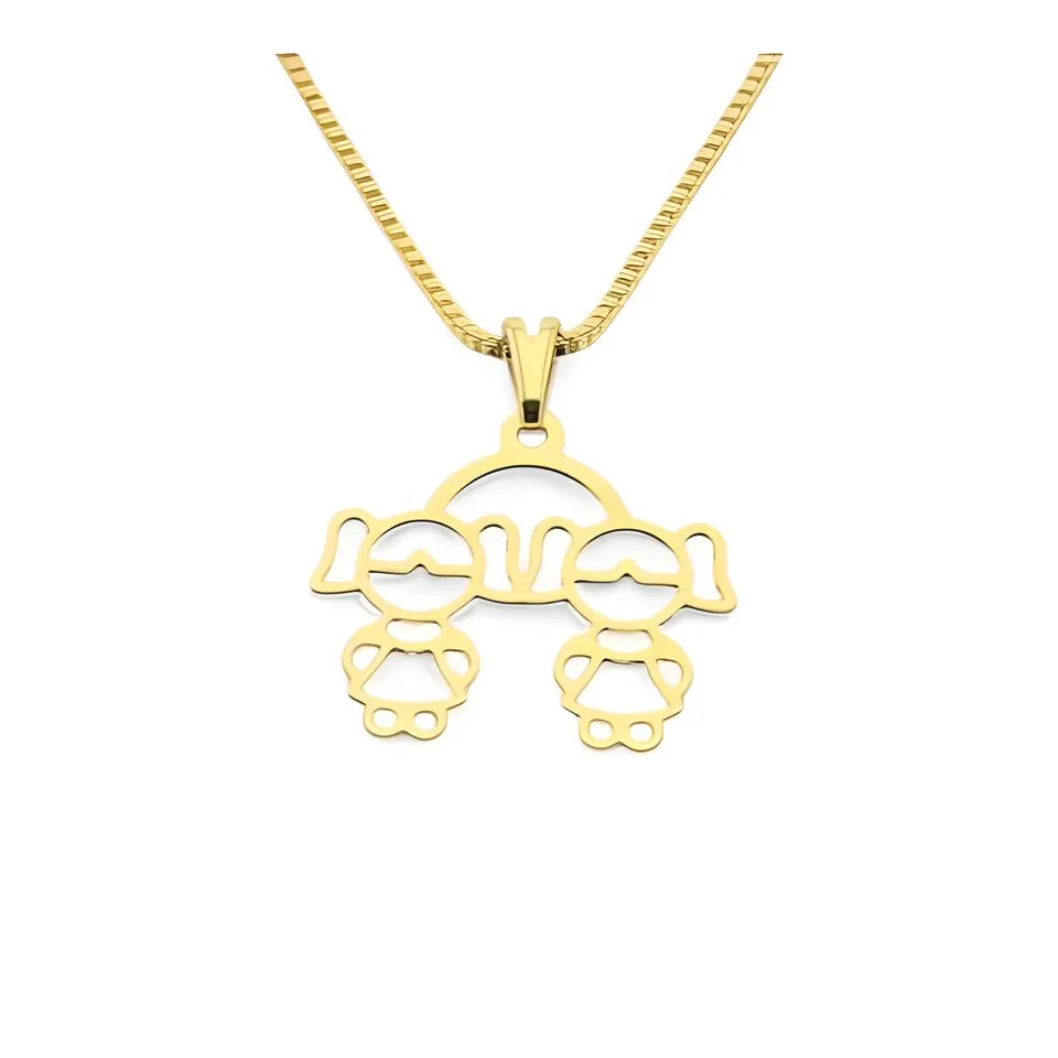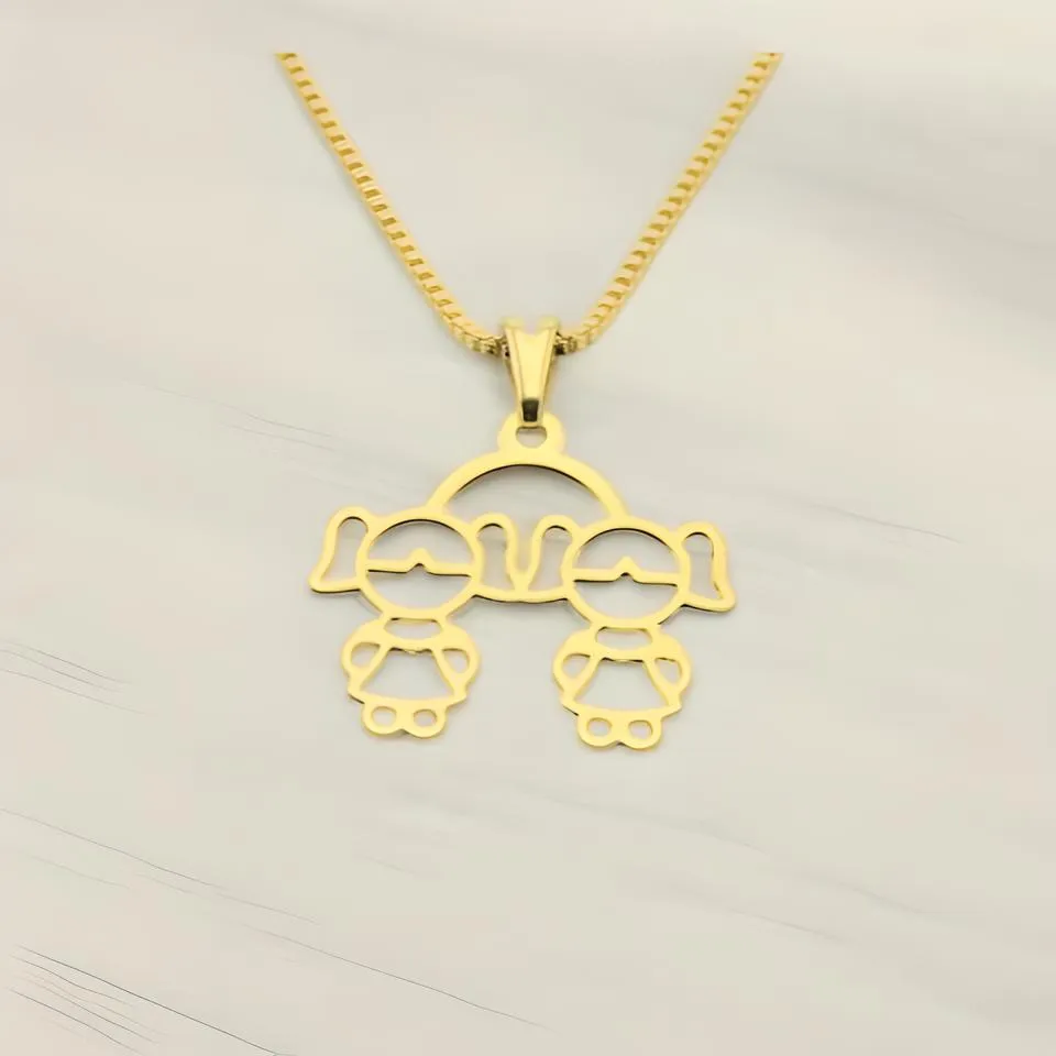 Pingente delicado em formato de duas meninas, banhado a ouro 18k. Perfeito para presentear ou celebrar a união entre irmãs! Um toque de amor e carinho em uma joia especial.